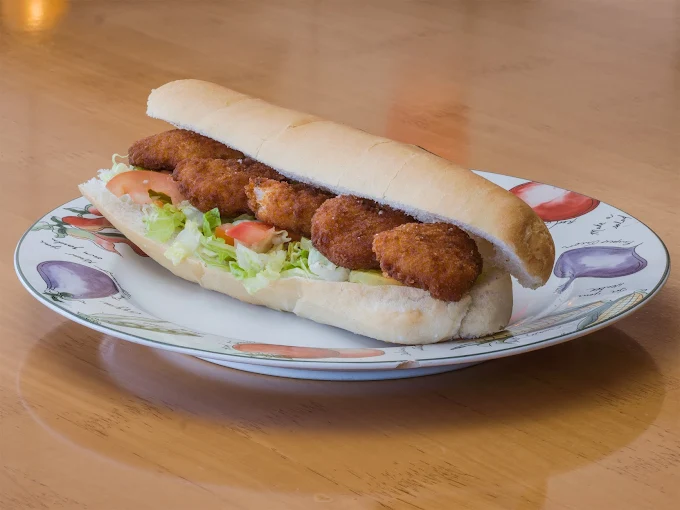 Crispy fried shrimp served on our traditional po-boy bread dressed with a garlic butter spread topped with dill pickles, lettuce and tomatoes